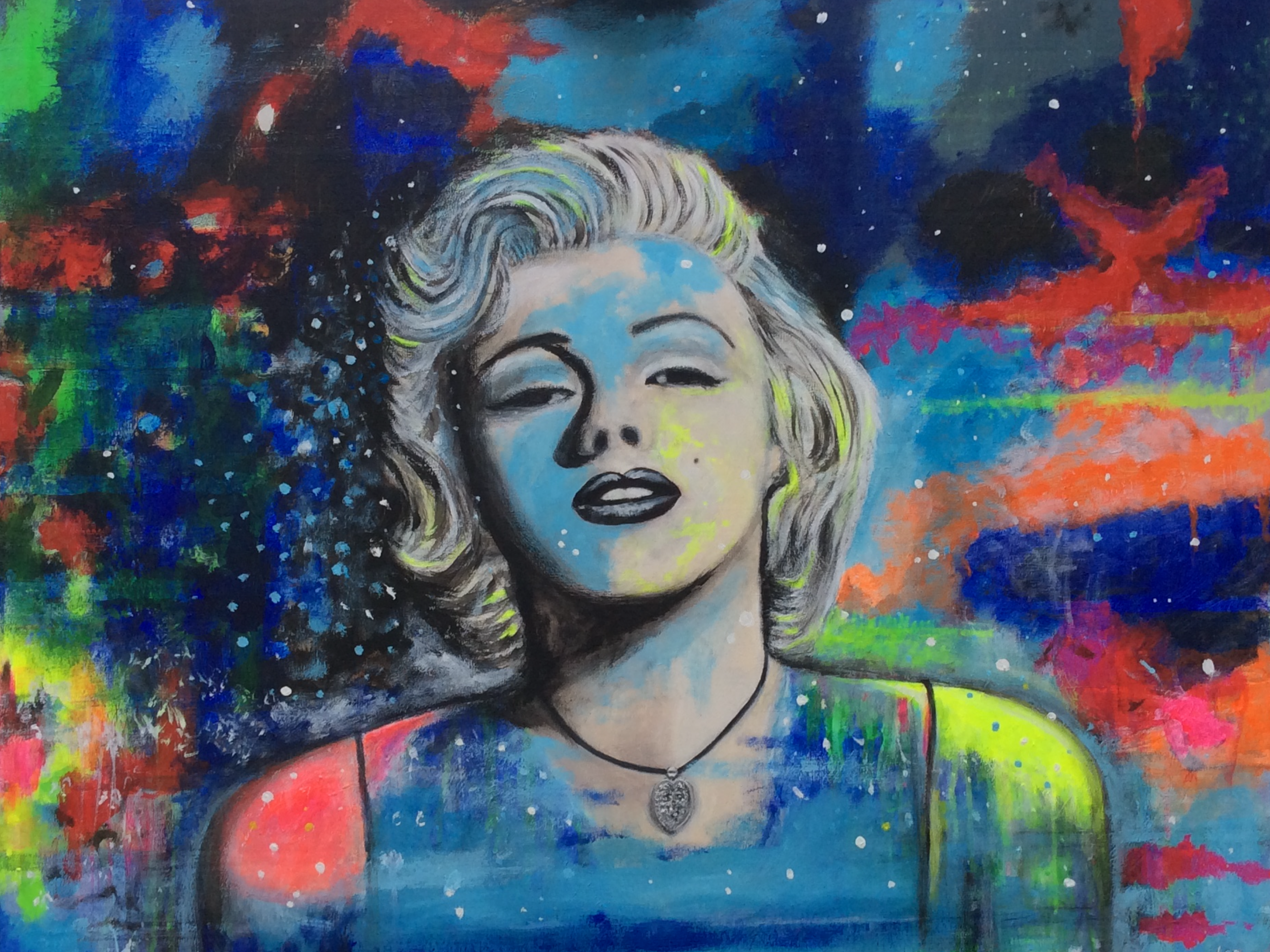 While painting the image of Marilyn Monroe, I happened to see Elton John step onto the stage. The way I interpreted the colors, lighting, and energy of his performance shaped the final piece for me.